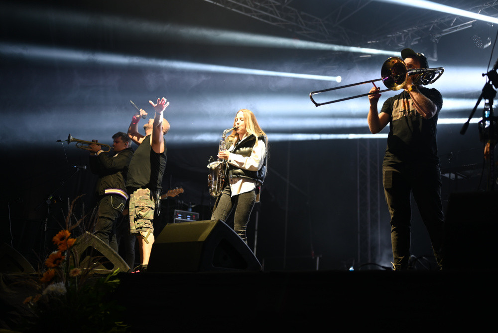 Wójt Gminy Banie Arkadiusz Augustyniak dzieli się chlebem dożynkowym z uczestnikami dożynek