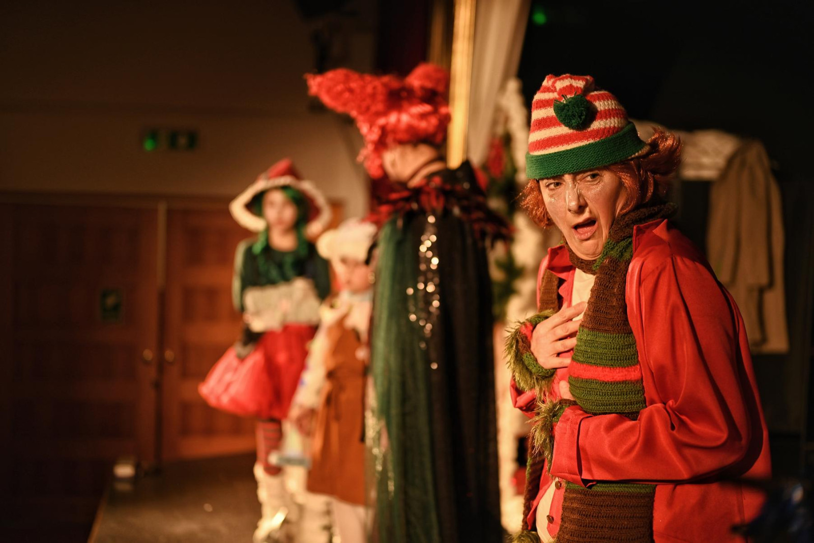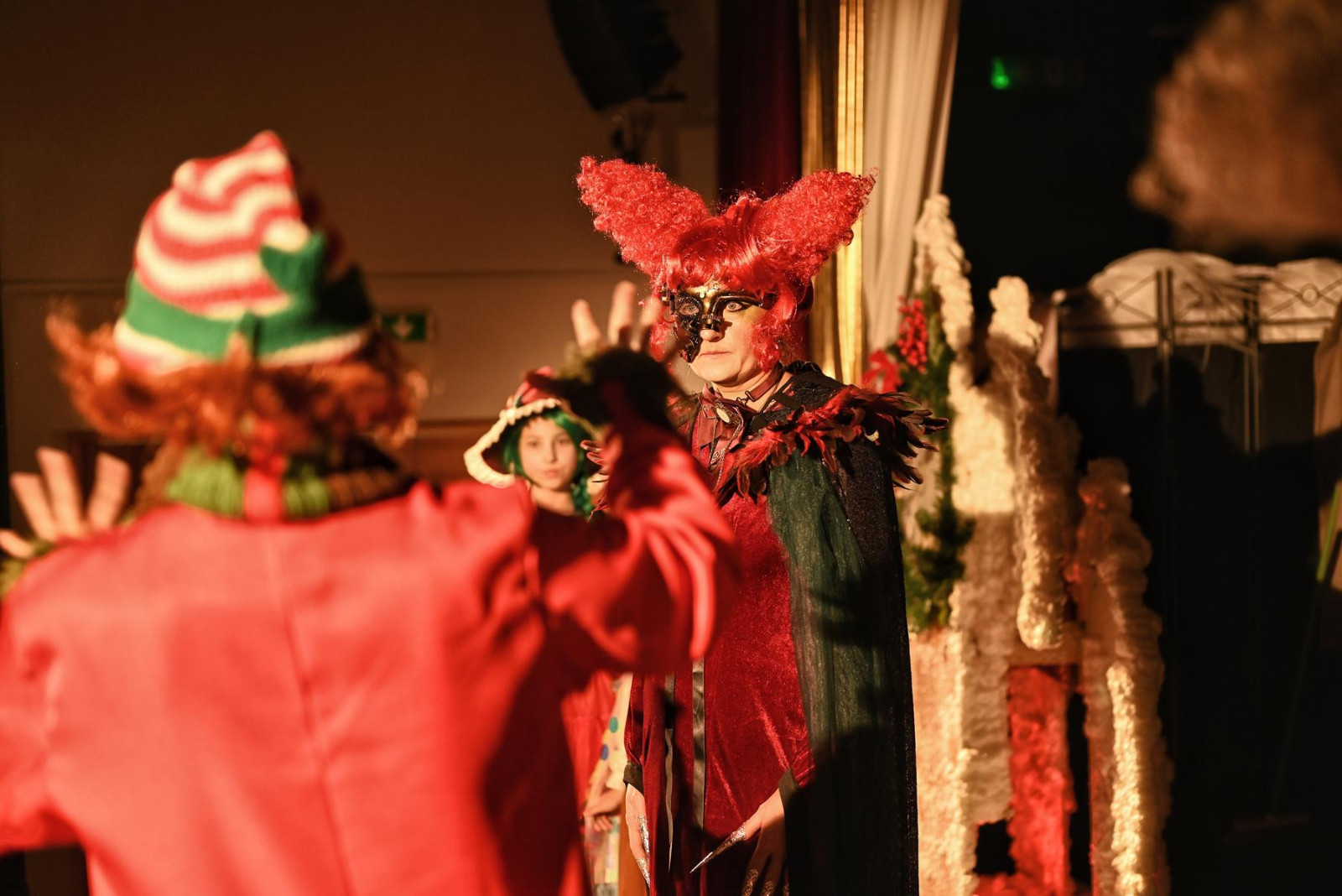 • Pani bałwan tańczy na scenie w zimowej, baśniowej dekoracji